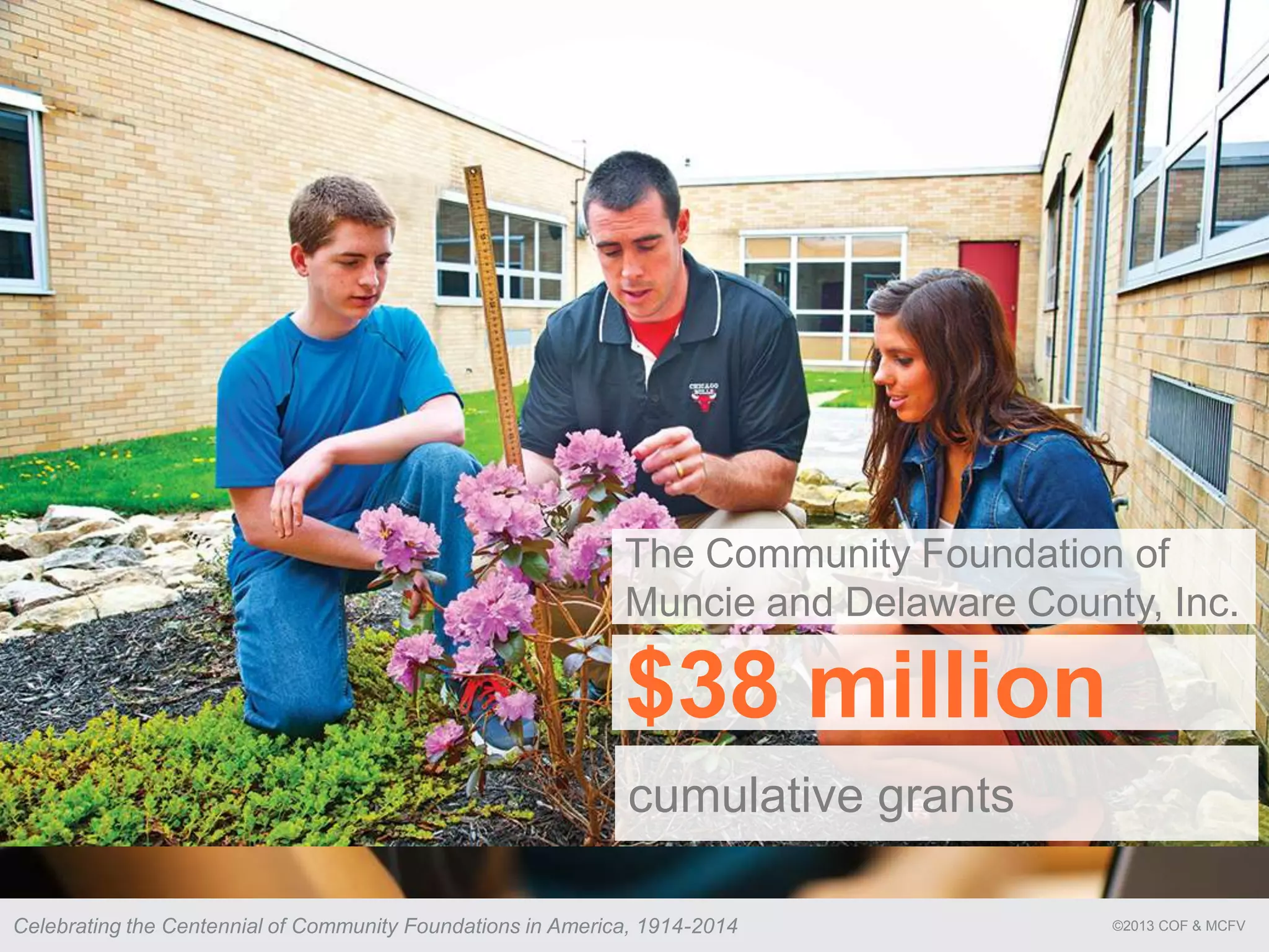The document highlights the centennial of community foundations in America, emphasizing the role of the Community Foundation of Muncie and Delaware County in granting $2 million to local causes. It outlines various charitable fund options, strategies for community engagement, and the importance of resident involvement in shaping initiatives. Additionally, it suggests that a 5% contribution from estates could generate significant long-term funding for community development.