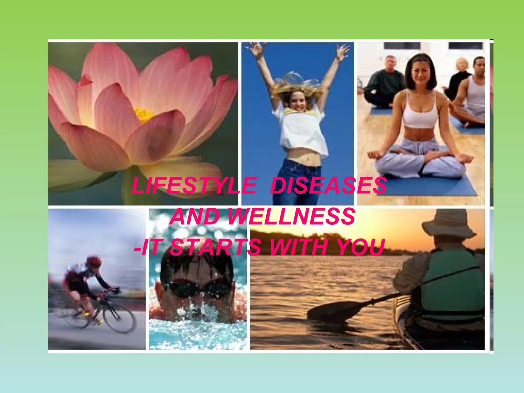 The document discusses lifestyle diseases and wellness. It states that lifestyle diseases like diabetes, hypertension and cancers are on the rise globally due to poor diets, physical inactivity, stress and other modern lifestyle factors. Adopting healthy behaviors like exercising regularly, eating nutritious foods, avoiding tobacco and managing stress can help prevent these diseases and promote overall wellness. The six key dimensions of health are also outlined.
