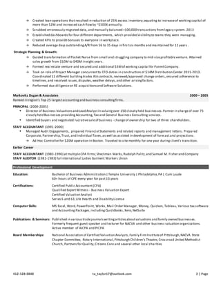 Timothy Taylor is an experienced CFO and financial executive with over 30 years of experience in public accounting, consulting, and senior management roles. He has a track record of guiding companies to double-digit annual growth through strategic planning, operational improvements, and financial management. Currently, he provides consulting services to start-ups and growing companies, helping with financial modeling, accounting systems, and strategic guidance.