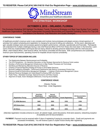 This document advertises a strategic workshop for healthcare CFOs to be held in Orlando, Florida. The workshop will provide case studies and strategies from leading healthcare organizations on topics like revenue generation, cost reduction, quality improvement, and the impacts of healthcare reform. It will discuss the role of the CFO and challenges they may face. Speakers include executives from major hospitals and health systems. Registration pricing and payment details are provided.