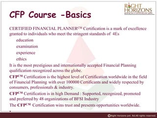 The document provides information about the Certified Financial Planner (CFP) certification. It discusses the 4E criteria of education, examination, experience, and ethics required to obtain the certification. It also outlines the course structure, exam pattern, registration process, fees, class schedule, and faculty for CFP training programs offered by Right Horizons Academy. The certification is recognized globally and demonstrates competency in providing financial planning services.