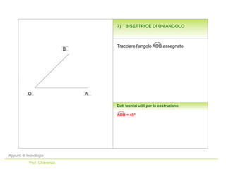 Il documento tratta della costruzione geometrica della bisettrice di un angolo di 45°. Vengono forniti passaggi dettagliati su come utilizzare un compasso per tracciare gli archi necessari e identificare i punti coinvolti. La descrizione culmina con l'unione del punto centrale con il punto finale per determinare la bisettrice.
