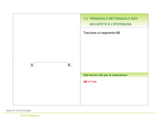 Il documento offre una guida pratica sulla costruzione di un triangolo rettangolo utilizzando un cateto e l'ipotenusa. Viene descritta la metodologia per tracciare i segmenti e gli archi necessari, insieme alle aperture del compasso per la costruzione geometrica. Le istruzioni dettagliate consentono di ottenere un triangolo rettangolo preciso attraverso operazioni di geometria piana.