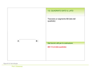 Il documento è un'unità didattica di tecnologia del prof. Chiarenza che descrive la costruzione geometrica di un quadrato dato il lato. Si forniscono passi dettagliati per tracciare il quadrato utilizzando un compasso con apertura specifiche. Vengono indicati vari punti e segmenti da unire per completare la figura.