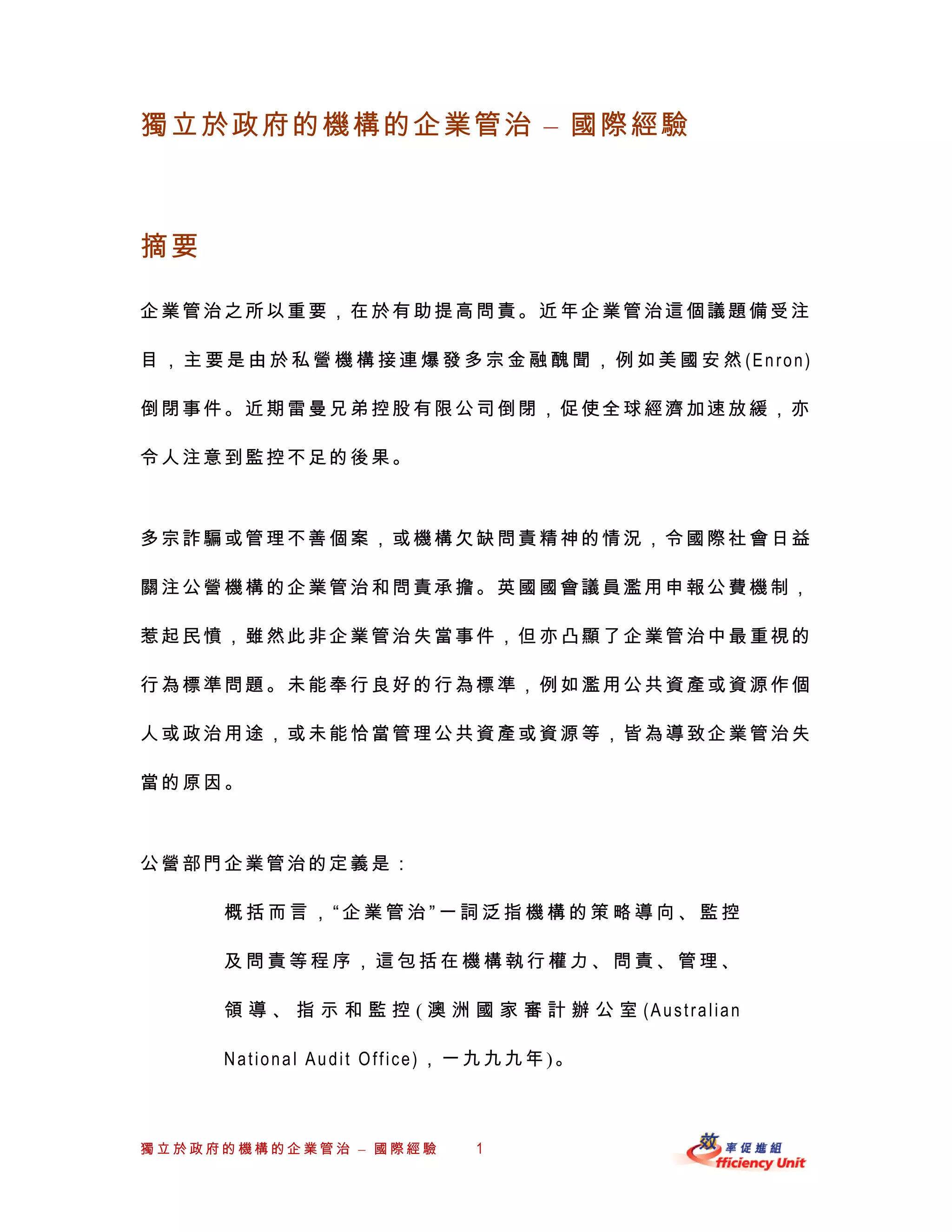 本報告探討獨立於政府的機構的企業管治,指出其重要性在於提高問責,尤其是在私營機構爆發多起金融醜聞後。公營部門企業管治面臨更多挑戰,涉及策略導向和監控程序,並強調行為標準和透明度的重要性。報告還討論了良好企業管治的範疇,包括組織架構、行為標準、風險管理和對外報告。