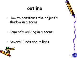 The document discusses various techniques for constructing shadows and lighting effects in 3D computer graphics, including using projection matrices to generate shadow polygons and accounting for factors like light source positioning, radial intensity attenuation, and surface reflectance properties. It also examines methods for animating camera movement and introducing texture mapping to surfaces.