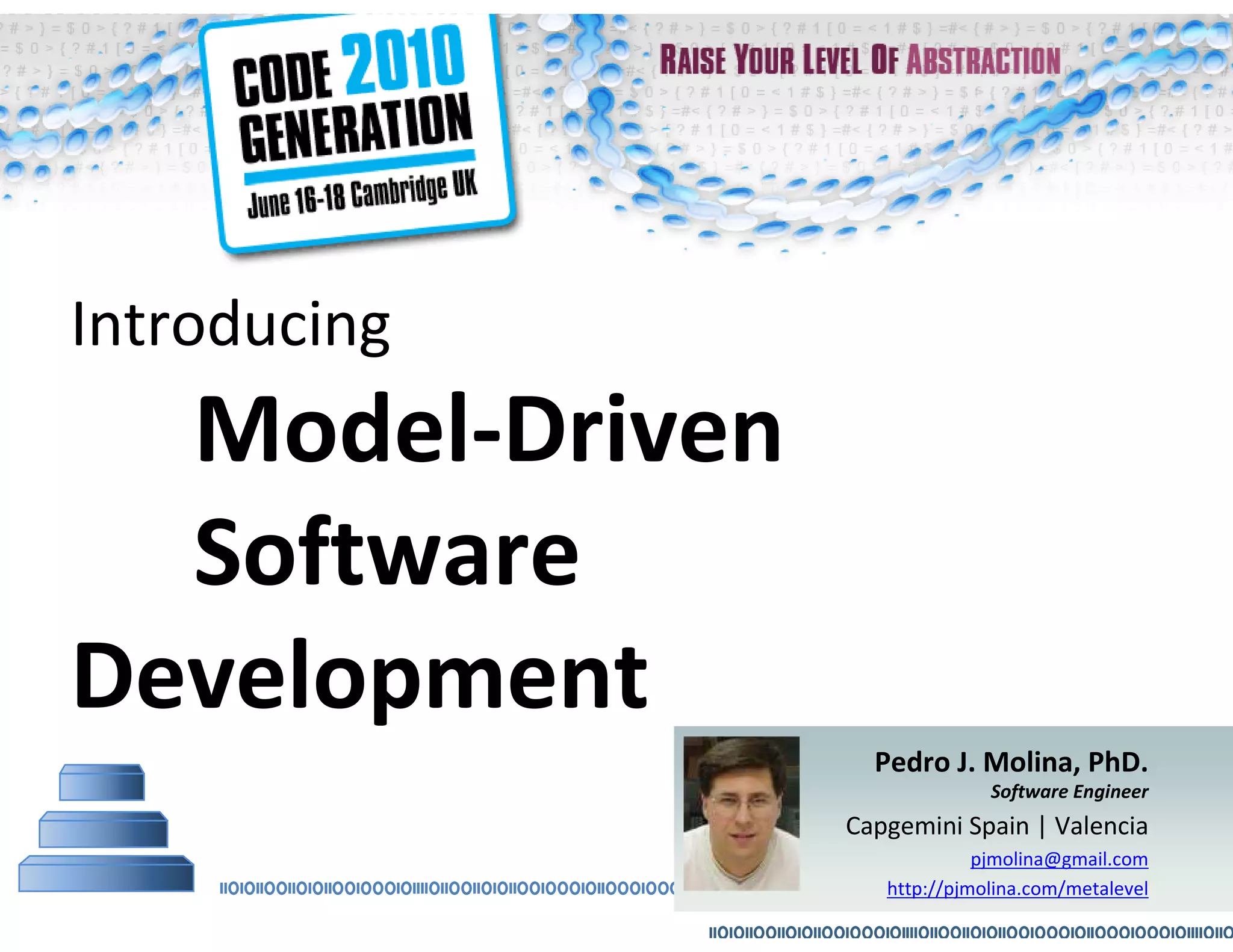 This document provides an introduction to model-driven software development (MDSD). It discusses what MDSD is, why organizations adopt it, and how it can be applied. Key aspects of MDSD covered include code generation, domain-specific languages, separation of concerns, and economic benefits such as reduced costs from economies of scale and scope. The document also reviews various tools and approaches used in MDSD, including those based on UML, EMF, and DSLs. It concludes by emphasizing that MDSD can help improve software productivity and help establish true software engineering practices.