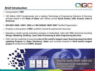 Consolidated Gulf Company is a 190 million USD conglomerate providing technology and engineering solutions across several industries. It has over 600 employees and offices in multiple countries. Some of its notable past projects include laser scanning of oil and gas facilities for Qatar Petroleum and KNPC of Kuwait. It offers multi-disciplinary engineering services including process, piping, civil, electrical and instrumentation design. It is also expert in laser scanning, BIM, GIS and manpower outsourcing.