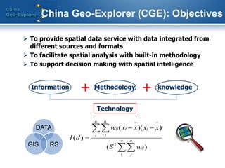 China Geo-Explorer (CGE) is a spatial data and analysis platform that integrates data from different sources and formats in China to facilitate spatial analysis and support decision making. CGE provides data from government statistics, censuses, and other sources with geographic boundaries and coordinates to allow for selection and analysis by administrative unit, region, location, or establishment. It features interactive maps, reports, charts and tables, spatial statistics tools, and customized output options to help users with research, education, business, and government planning needs.