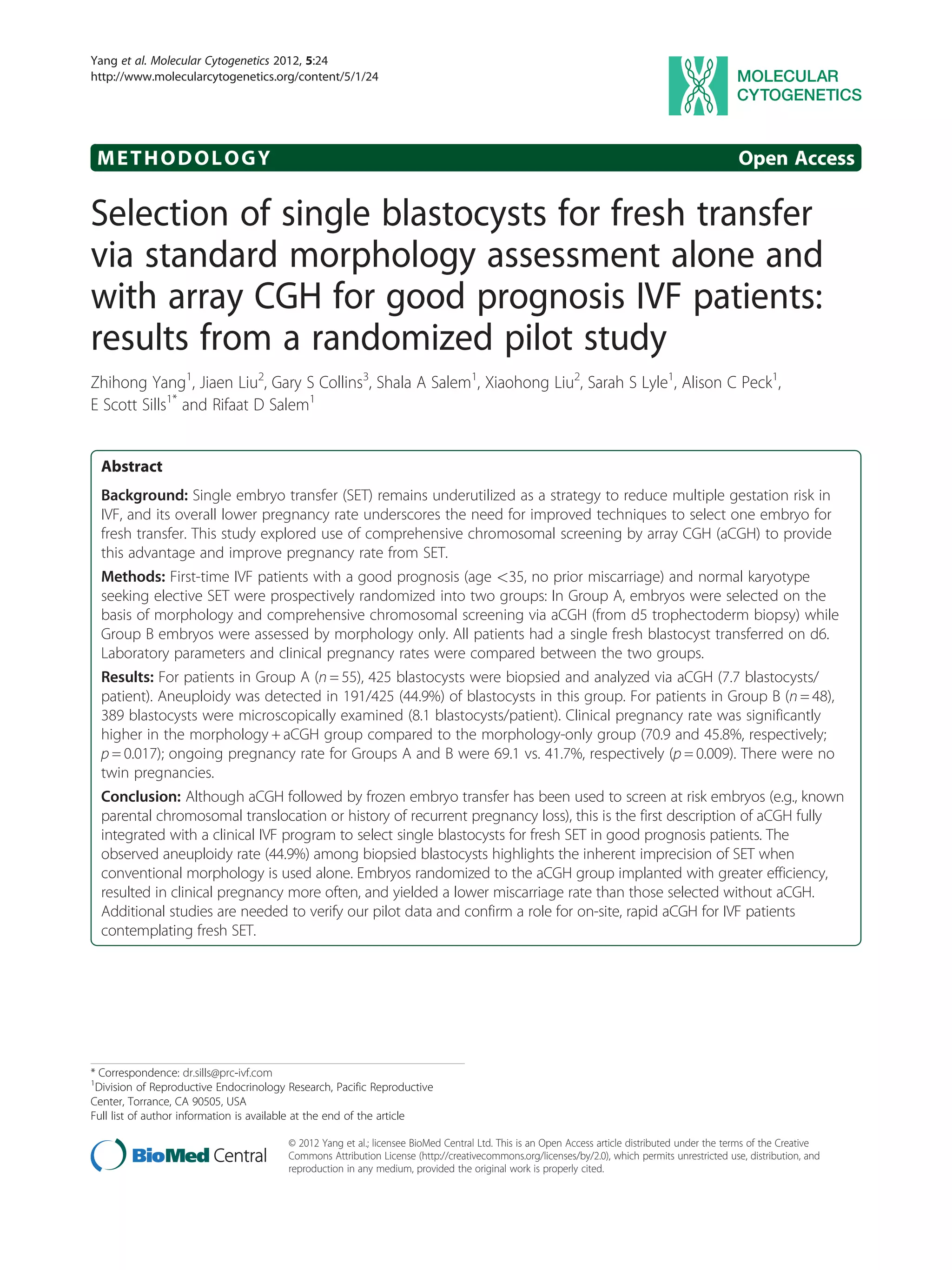 This study compared pregnancy outcomes of in vitro fertilization (IVF) patients who underwent single embryo transfer where the embryo was selected based on (1) morphology alone or (2) morphology assessed with array comparative genomic hybridization (aCGH). Patients were randomly assigned to one of the two selection methods. The clinical pregnancy and ongoing pregnancy rates were significantly higher in the group where aCGH was used in addition to morphology to select the embryo. No twin pregnancies occurred. The results suggest that aCGH may improve pregnancy outcomes compared to morphology alone by detecting chromosomal abnormalities.