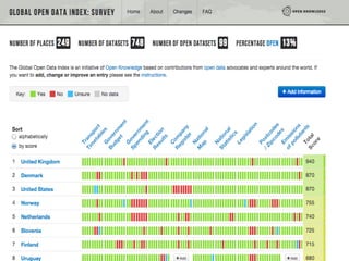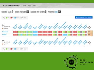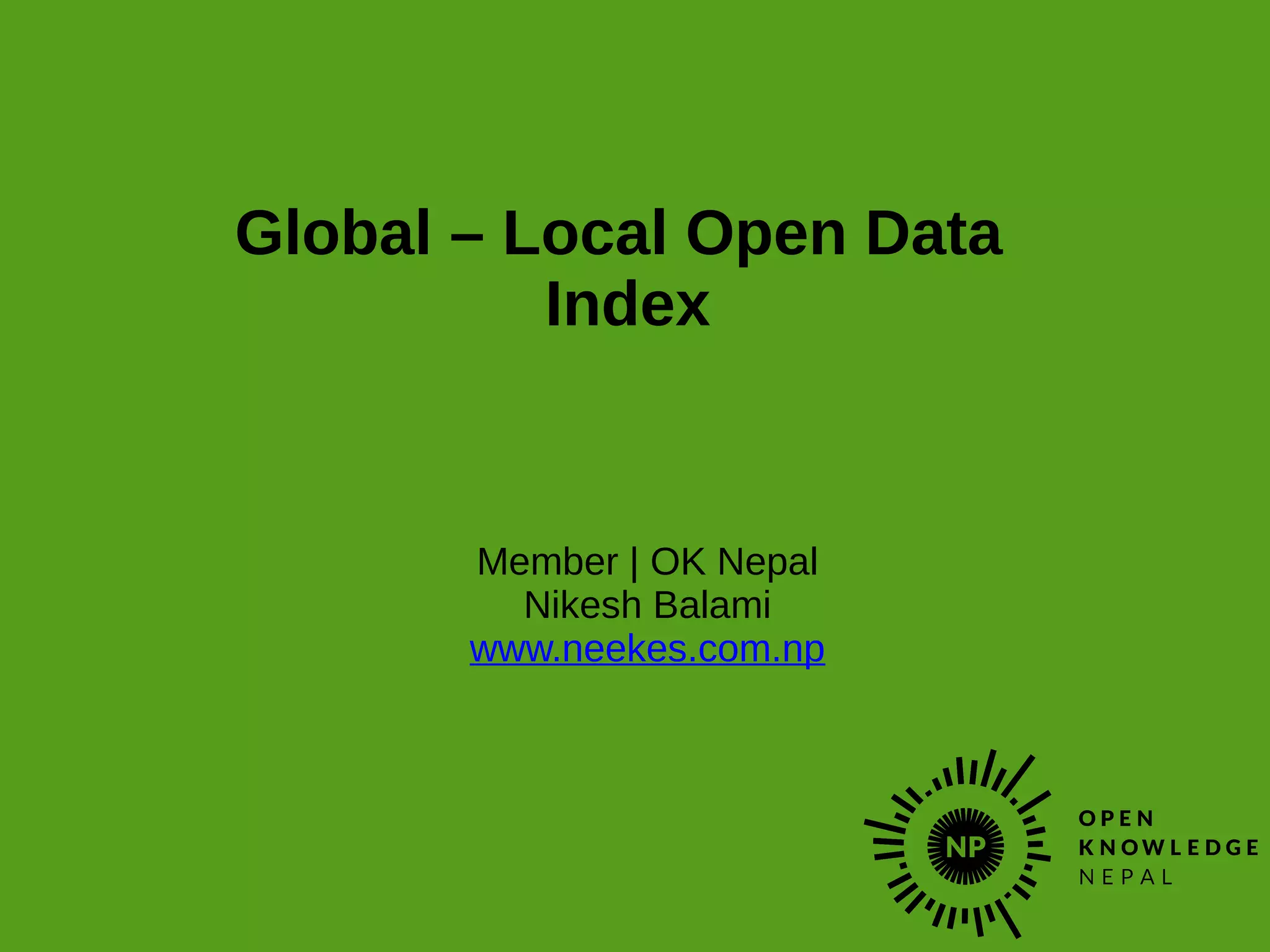 The document discusses the Global Open Data Index, which measures and benchmarks open data around the world. It presents this information in an easy to understand way and is detailed on a country by country basis. The primary goal is to monitor the status of open data globally, with a focus on whether data is accessible and can currently be used. The document encourages contributions to the Local Open Data Index for Nepal to provide information on whether specific types of data exist, are digital, publicly available, free, online, machine readable, available in bulk, openly licensed, and up-to-date.