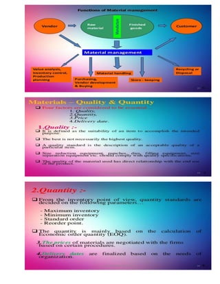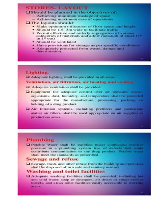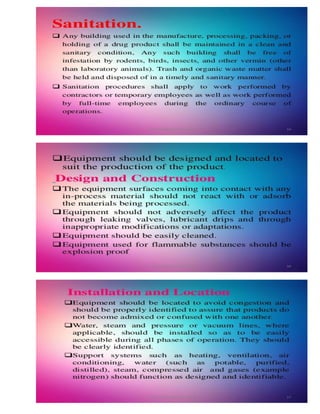 The document summarizes key aspects of cGMP (current good manufacturing practices) and industrial management for pharmaceutical manufacturing. It discusses how cGMP regulations ensure drug quality and safety by establishing minimum requirements for facilities, equipment, and manufacturing processes. The document also outlines several important considerations for industrial management, including plant layout and organization, production planning and control, inventory management, quality management, and cost control. The overall goal is to integrate all functions for efficient and compliant pharmaceutical production.