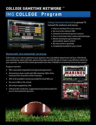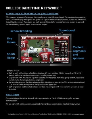 The College Gametime Network allows schools to generate incremental revenue through a new type of inventory for sponsors, including live games, school branding, and sports tickers that can include content segments and sponsor spots. Interested schools can contact the College Gametime Network located in Charlotte, North Carolina to discuss next steps.