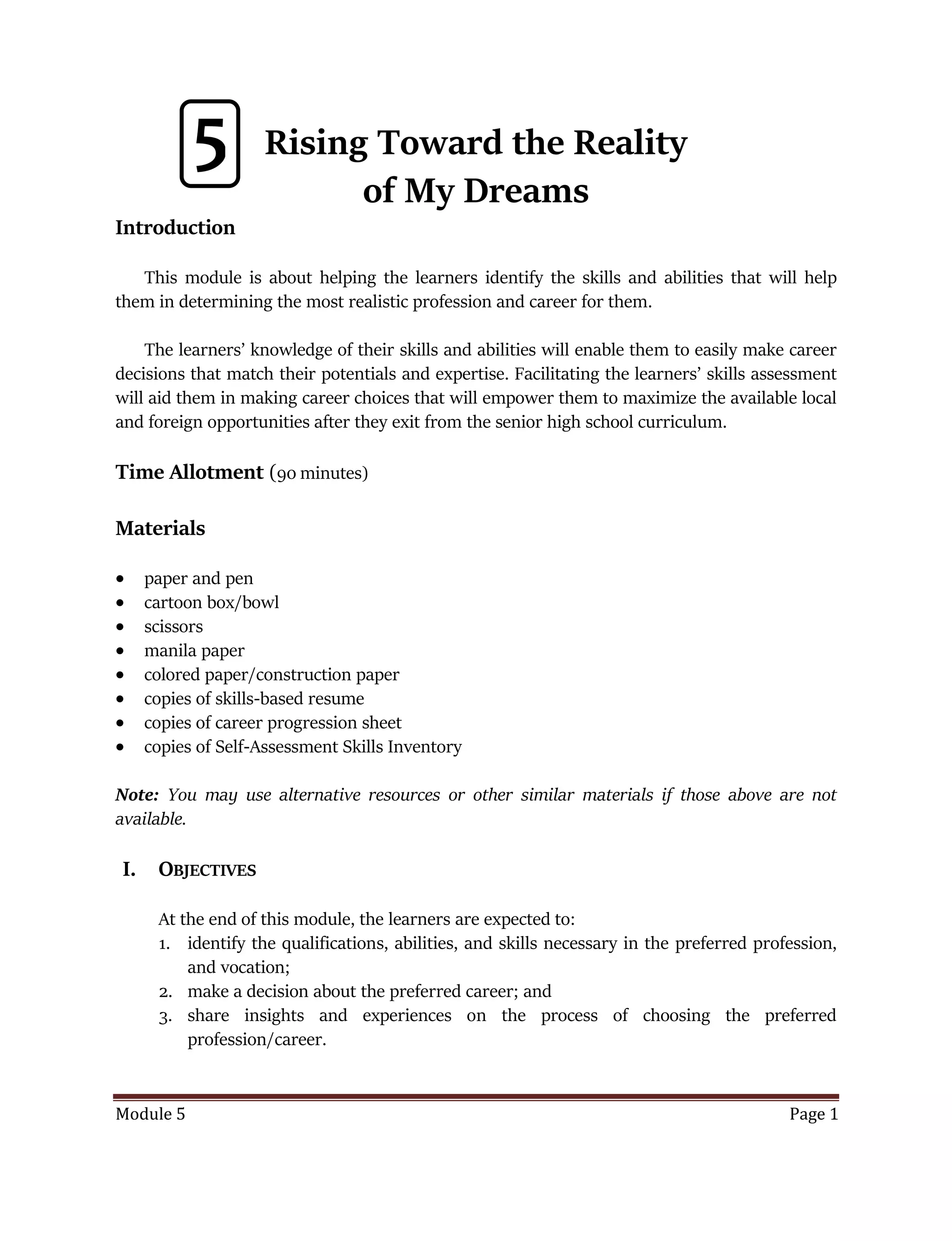 This document outlines a module aimed at helping learners identify their skills and abilities to make informed career choices after high school. It includes activities for self-assessment, group discussions on career qualifications, and guidance on resume writing, emphasizing the importance of both hard and soft skills in achieving career success. Additionally, it incorporates practical exercises like the elevator pitch to prepare students for job interviews and market themselves effectively.