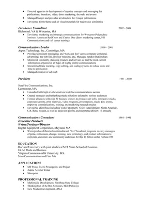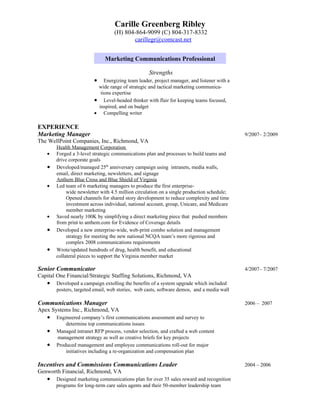 Carille Greenberg Ribley is a marketing communications professional with over 30 years of experience developing strategic communications plans and materials. She has expertise in project management, writing, budgeting, and leading teams. Her experience includes positions as a Marketing Manager, Communications Manager, and owning her own consulting firm.