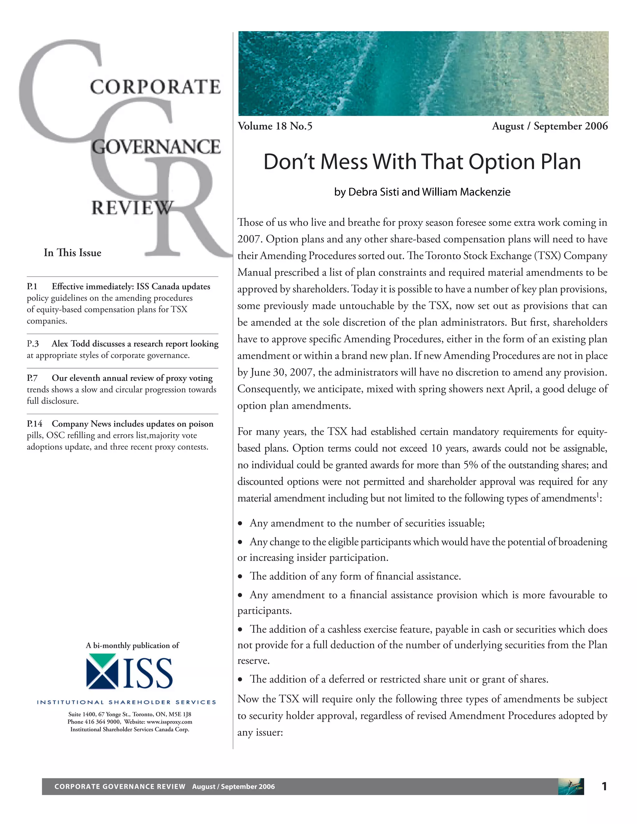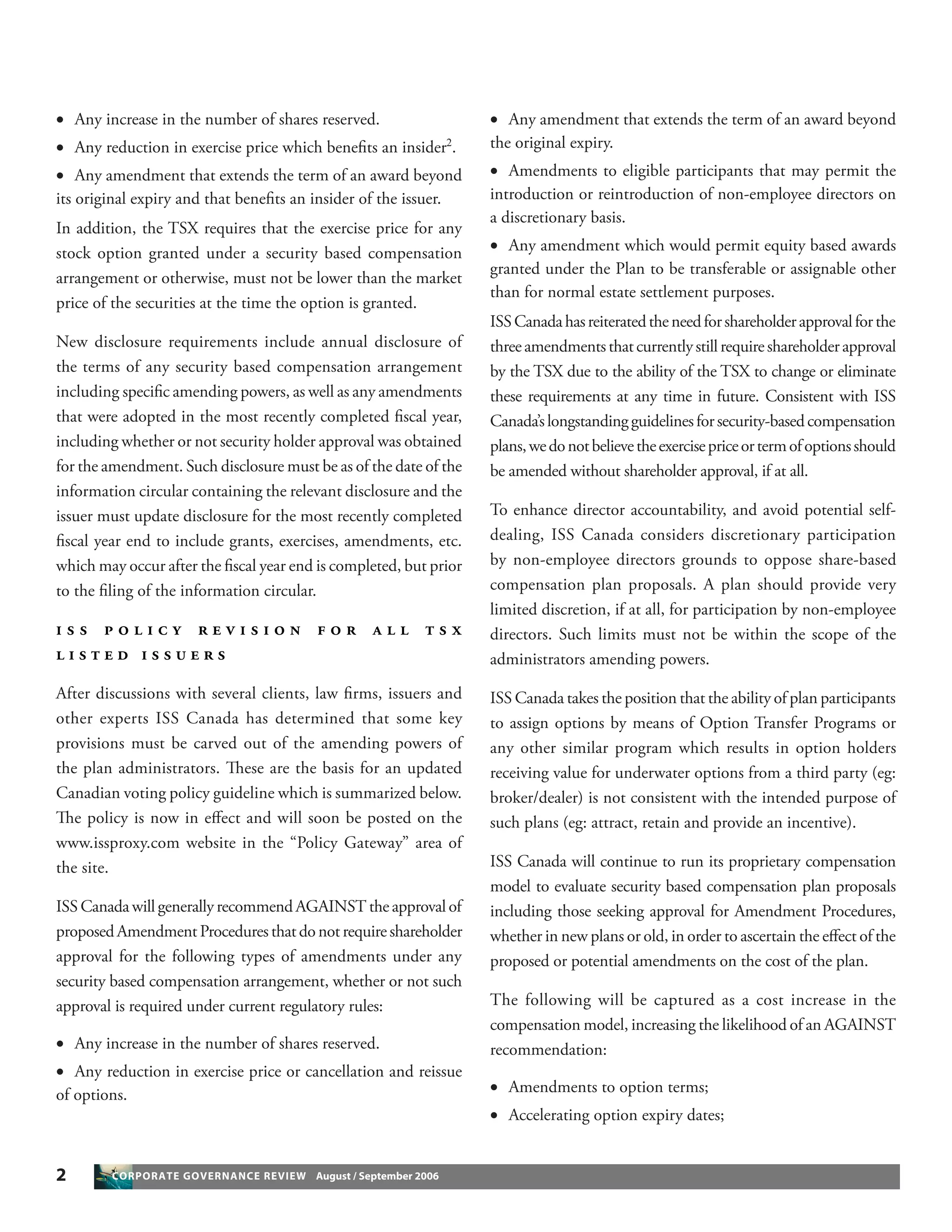 - ISS Canada has updated its voting policy guidelines. It will generally recommend voting against amending procedures that do not require shareholder approval for increases to shares reserved, reductions to exercise