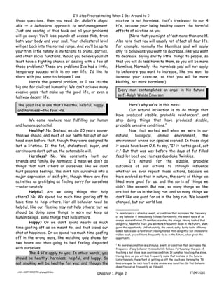 This chapter introduces the concept of procrastination as a problem for modern humans. It argues that while following one's instincts may have worked in ancient times, today many pleasurable activities are unhealthy. It presents a framework of achieving the "4 H's" - being healthy, harmless, helpful, and happy - as a way to overcome procrastination and live better. The chapter analyzes why natural human tendencies lead to procrastination in the modern world and previews techniques that will be discussed to help manage behavior and achieve goals.