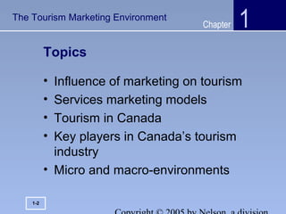 This chapter discusses the tourism marketing environment and key concepts related to tourism services. It covers the unique characteristics of services, the services marketing triangle, and the expanded 7 Ps marketing mix for services. It also provides an overview of tourism in Canada, noting that Canada is a top international destination and tourism contributes significantly to the GDP and employment. Finally, it examines the microenvironment and macroenvironment forces shaping the tourism industry, including demographic, economic, cultural, technological, political/legal, and environmental factors.
