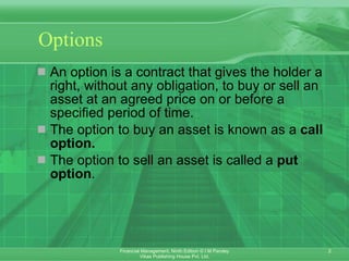The document discusses options and their valuation. Some key points: