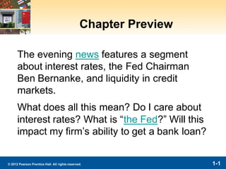 This document is the first chapter of a textbook on financial markets and institutions. It introduces why students should study these topics. It discusses that financial markets like bond and stock markets channel funds from savers to investors, promoting economic efficiency. It also explains that the Fed, interest rates, and liquidity mentioned in news reports can impact personal wealth and businesses. The chapter then summarizes key topics that will be examined in the course, including debt markets, interest rates, the stock market, and foreign exchange markets. It also discusses the structure and risks of financial institutions. The objectives are for students to understand how these markets function and use models to analyze issues and consequences of events like financial crises.