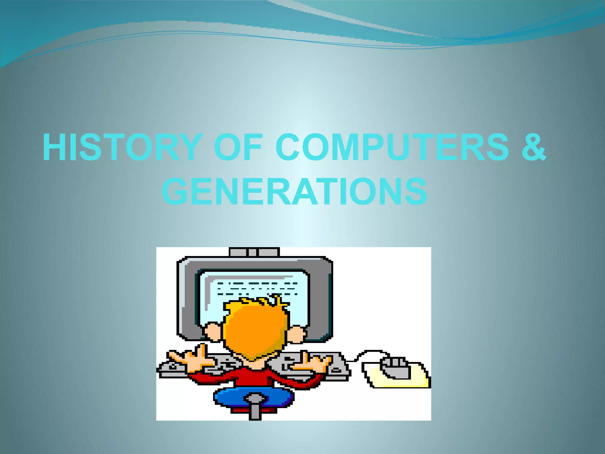 The document provides a history of computers from ancient calculating devices like the abacus to modern generations. It discusses five generations of computers: 1) Vacuum tube computers, 2) Transistor computers, 3) Integrated circuit computers, 4) Microprocessor computers, and 5) Potential artificial intelligence computers. Key developments included the invention of the transistor, integrated circuit, microprocessor, and continued advancement toward artificial intelligence through parallel processing. The generations saw computers decrease dramatically in size while increasing dramatically in speed and capabilities.