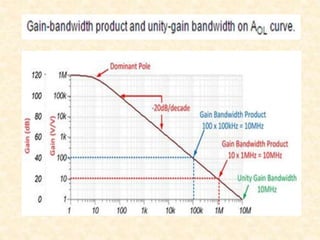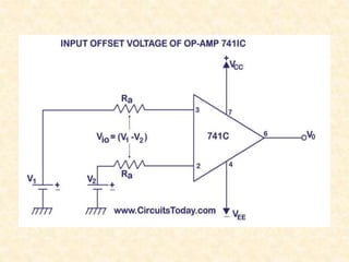 The document discusses integrated circuits and operational amplifiers. It begins by defining an integrated circuit and listing its advantages. It then describes the two main types of integrated circuits - linear and digital ICs. The document goes on to explain operational amplifiers in detail, including their ideal characteristics, block diagram, equivalent circuit model, open-loop configurations, and applications. It also provides information about specific op-amps like the 741 and TL082, discussing their features, input and bias currents, and common mode rejection ratio.