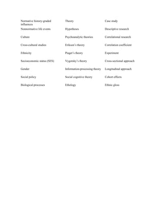 This chapter outlines the key learning goals and terms related to studying life-span development from a distinctive perspective. The four main goals are to: 1) discuss the life-span perspective and its characteristics; 2) identify important developmental processes, periods, and issues; 3) describe major theories of human development; and 4) explain how research in this field is conducted. Key terms defined include concepts like development, culture, theories, and research methods.