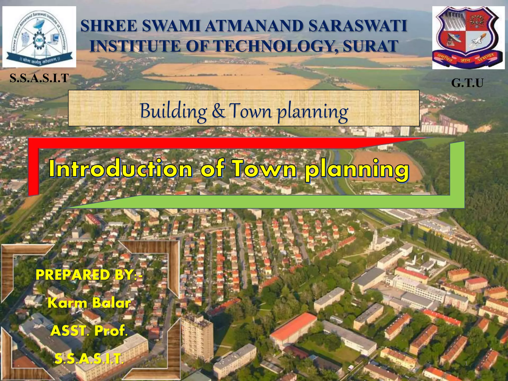Town planning is both an art and a science that aims to organize land use and infrastructure in a way that maximizes economy, convenience, and beauty. It involves collecting and analyzing data to arrange components of a town or city, including transportation networks, public buildings, housing, recreation areas, and zoning. Proper town planning is necessary to avoid uneven and chaotic development, congestion, and unhealthy living conditions without adequate amenities. Key principles of town planning include zoning land uses, establishing green belts, providing different housing types, well-placed public buildings, recreation centers, efficient road and transportation systems.