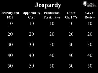 This document contains questions and potential answers about economics, factors of production, the Constitution, and key Supreme Court cases. It tests knowledge on topics like opportunity cost, production possibilities curves, scarcity, entrepreneurship, judicial review, implied powers, Federalists, and the Great Compromise between large and small states over representation in Congress. The final Jeopardy question asks about the difference between a shortage and scarcity.