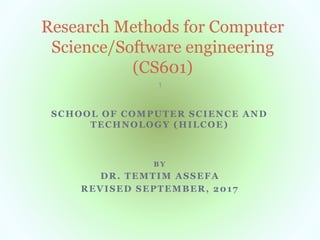This document outlines the learning objectives and content for a course on research methods for computer science and software engineering. The objectives include explaining the purpose of research, understanding basic research concepts, acquiring skills to formulate research problems and design research projects. The document discusses different research approaches like quantitative, qualitative and design science methods. It also covers topics like theories, constructs, variables, conceptual frameworks, propositions, and hypotheses. The teaching methods will include lectures, group work, projects and presentations. Students will be evaluated based on assignments, exams and participation.