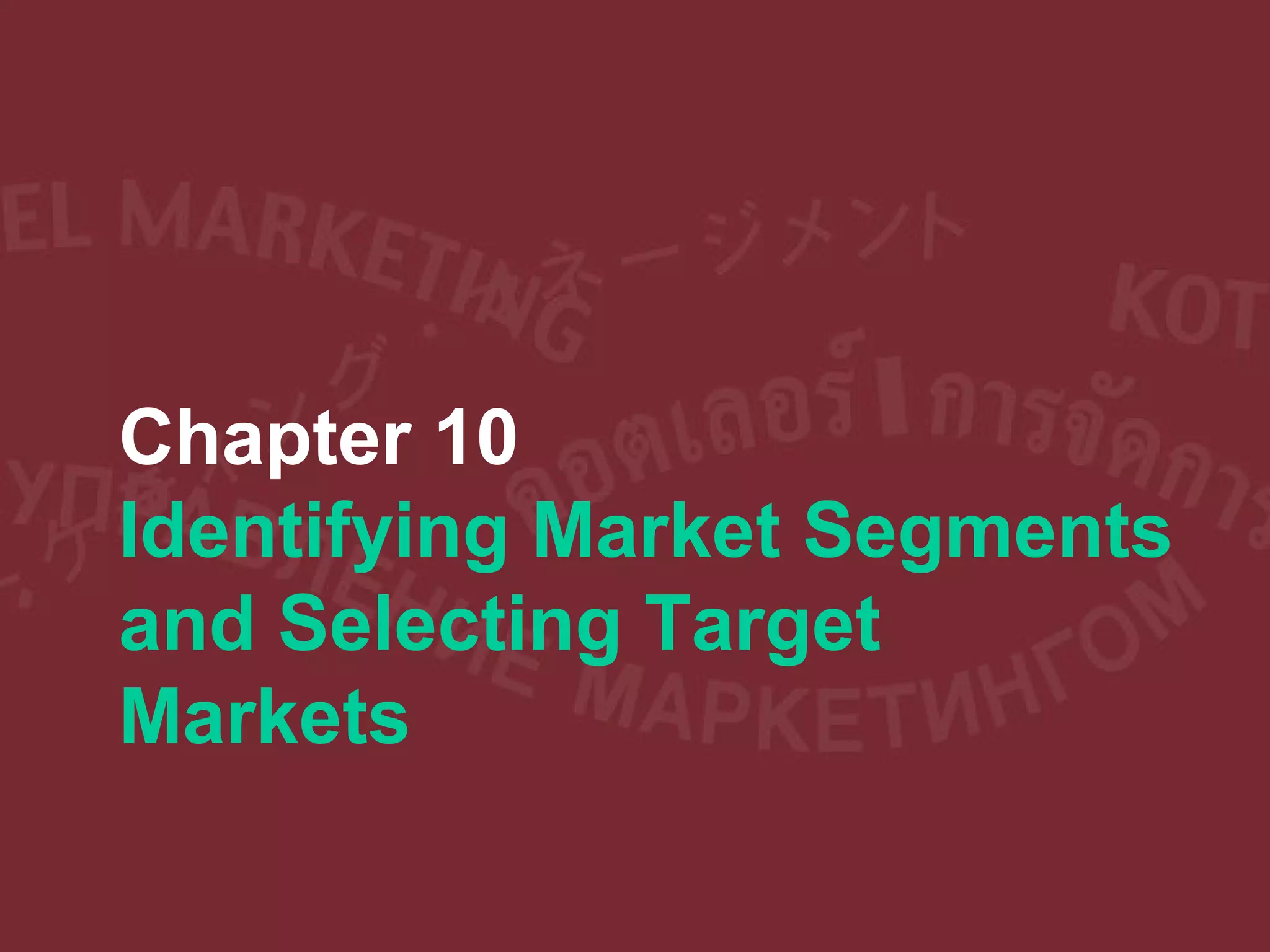 This document discusses market segmentation and target market selection. It covers identifying distinct customer groups, evaluating segments to select target markets, and developing positioning strategies for each target. Key points include: