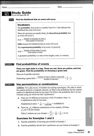 The document discusses finding probabilities and permutations. It provides examples of calculating probabilities of events occurring and permutations of objects. This includes: