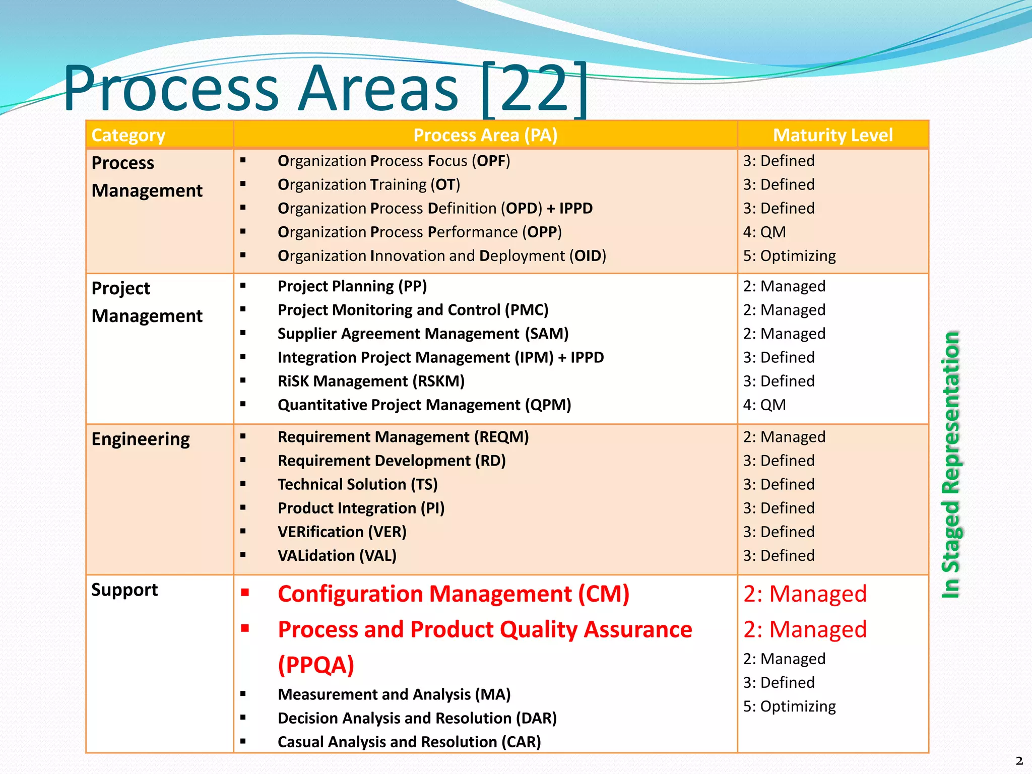 The document describes configuration management and process and product quality assurance. For configuration management, it discusses the specific goals of establishing baselines, tracking and controlling changes, and establishing integrity. It provides details on specific practices such as identifying configuration items, establishing a configuration management system, and creating/releasing baselines. For process and product quality assurance, it discusses the specific goal of objectively evaluating processes and work products and providing objective insight by communicating issues.