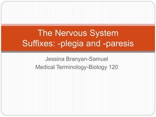 The nervous system receives sensory information and sends motor commands. It is divided into the central nervous system (brain and spinal cord) and peripheral nervous system (cranial and spinal nerves). The document discusses medical suffixes -plegia (paralysis) and -paresis (weakness) as they relate to nervous system disorders. Examples are given such as Bell's palsy, Guillain-Barré syndrome, and spinal cord injury for -plegia and Parkinson's disease, transient ischemic attack, amyotrophic lateral sclerosis, and myasthenia gravis for -paresis. Causes and treatments are described for some of these conditions.