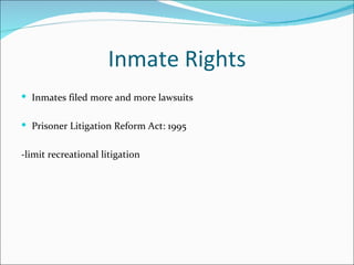 Inmates retain some constitutional rights during incarceration but lose others. The hands-off doctrine originally meant courts avoided scrutinizing prisons, but intervention increased in the 1960s. Now courts balance deference to prisons with protecting inmates from cruel treatment or discrimination based on race/religion. The Prison Litigation Reform Act of 1995 aimed to curb frivolous lawsuits by imposing filing fees and limits on complaining about confinement conditions.
