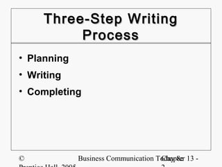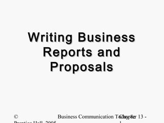 The document discusses the process of writing business reports and proposals. It covers planning the document, adapting to the audience, determining the appropriate structure based on the type of document and purpose, and guidelines for drafting the different sections including the introduction, body, and closing. The document also provides guidance on consistent formatting and use of technology tools to create reports and proposals.