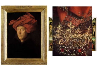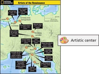 The document summarizes the spread of the Northern Renaissance in Europe. It discusses how the printing press helped spread Renaissance ideas by making books cheaper and more accessible. Key northern Renaissance artists including Jan van Eyck, Albrecht Dürer, and Pieter Bruegel are profiled for developing realistic painting techniques and styles. Writers such as Desiderius Erasmus and Thomas More are also mentioned for critiquing society and advocating humanist ideals through their works.