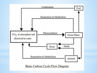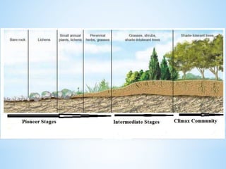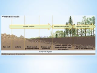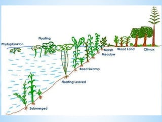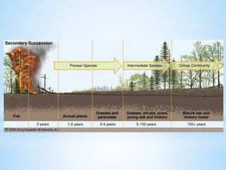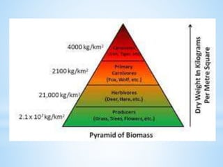 An ecosystem is a functional unit consisting of living organisms interacting with each other and their non-living environment. Key components include producers, consumers, and decomposers interacting within a web of food chains and nutrient cycles. Energy enters through producers via photosynthesis and is transferred between trophic levels, with only 10% typically being transferred between adjacent levels as depicted in ecological pyramids. Ecosystems also cycle nutrients and undergo successional changes over time as conditions change.
