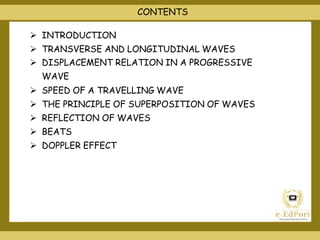 This document covers various topics related to waves including different types of waves, wave properties such as amplitude and wavelength, and concepts such as superposition, reflection, and standing waves. It discusses transverse and longitudinal waves, the displacement relation for progressive waves, and formulas for the speed of sound and waves on strings. Reflection at closed and open boundaries is examined, showing how the