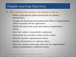 This document discusses organizational culture, including how cultures form and are transmitted within organizations. It covers the key topics of defining organizational culture, comparing functional and dysfunctional effects, identifying how culture is created and sustained, examining methods of cultural transmission, and exploring how to create ethical and positive cultures. The document also discusses spiritual culture and the global implications of organizational culture.