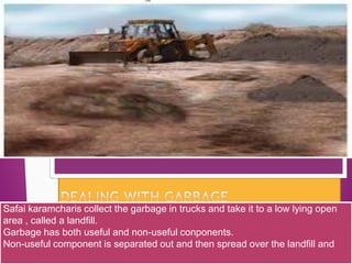 Safai karamcharis collect garbage in trucks and take it to a landfill, a low-lying open area. Non-useful garbage components are separated out, spread over the landfill, and covered with soil. Once full, compost making areas are developed near the landfill to deal with some useful garbage components. The method of preparing compost with redworms is called vercomposting. Paper, plastic, metal and glass are recycled by cleaning, breaking down, and remolding into new objects. Recycling is important for a cleaner planet with less waste.