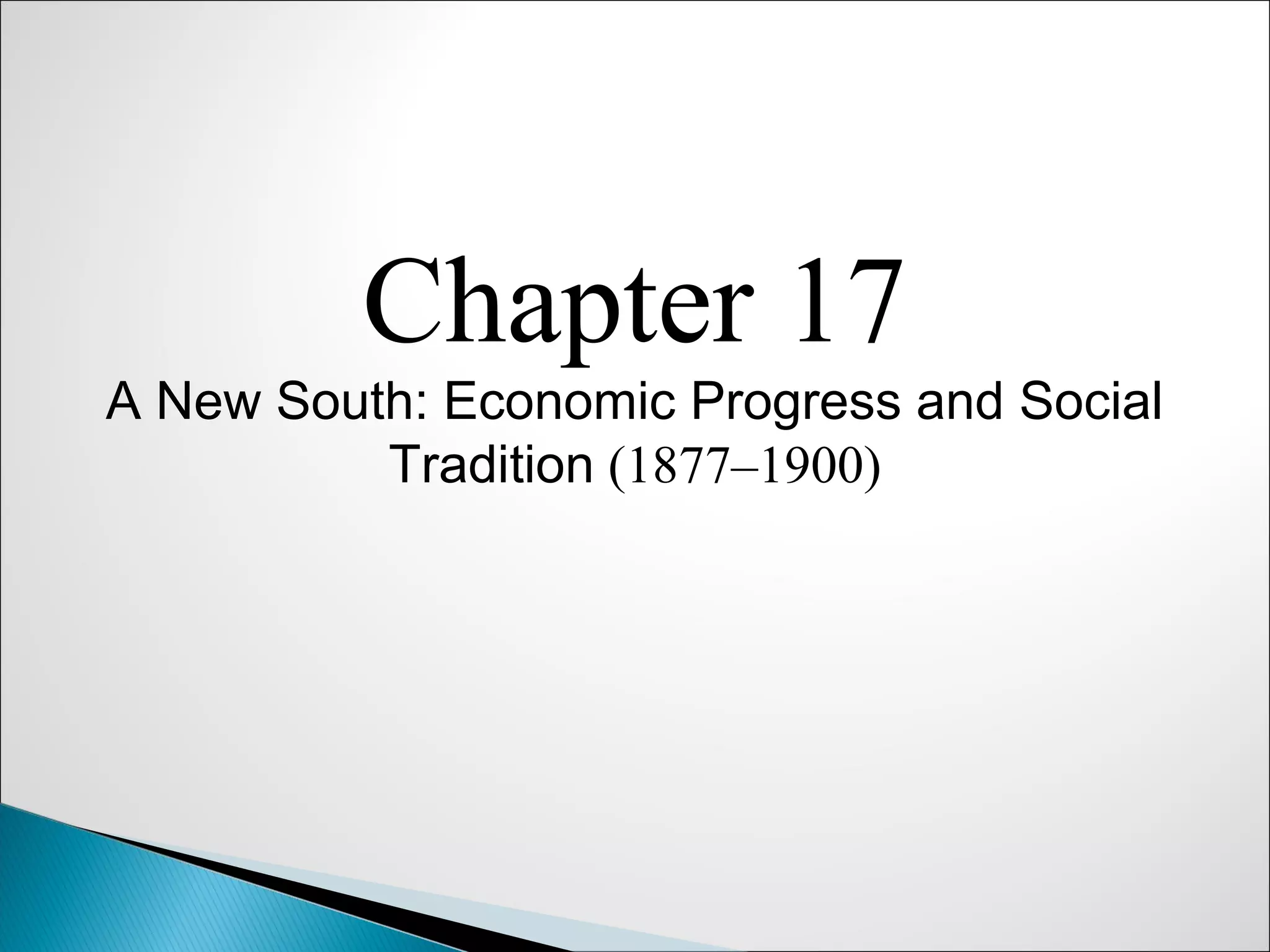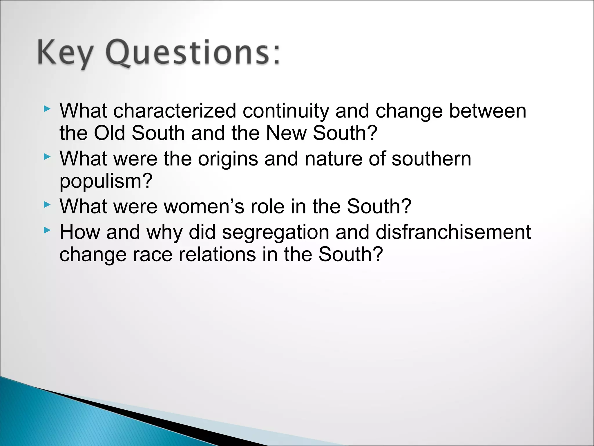 The document summarizes key events and developments in the post-Civil War South between 1877-1900. It discusses the economic growth of industries like steel, textiles and railroads that characterized the New South. However, the South remained economically dependent on the North. It also examines the rise of southern populism in response to economic hardship among farmers and the growth of segregation and disfranchisement that disenfranchised African Americans and reinforced white supremacy.