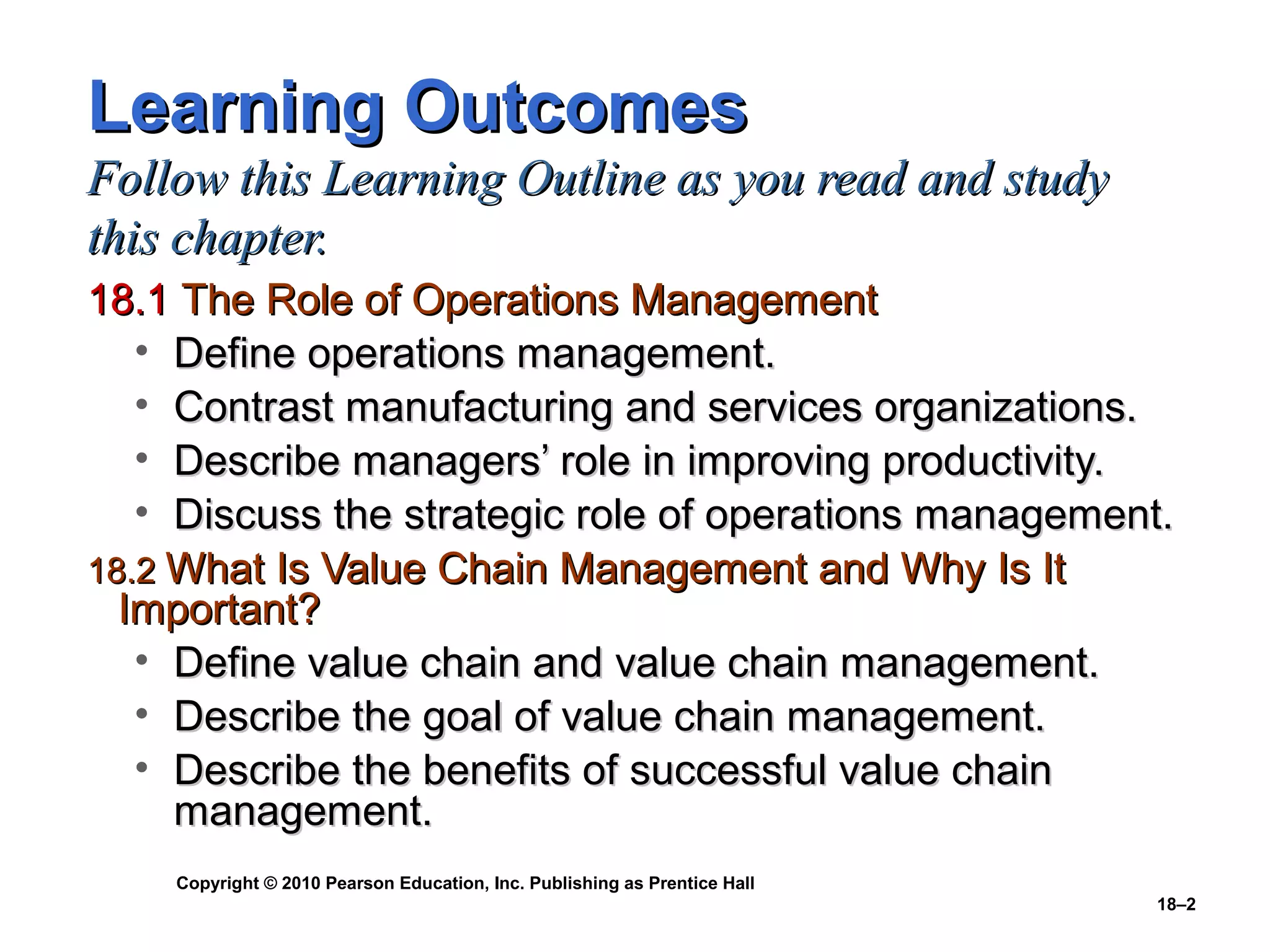 This chapter discusses operations management and key related concepts. It defines operations management as designing, operating, and controlling processes that transform inputs like labor and materials into goods and services. Value chain management aims to fully integrate all members of the production process to maximize value for customers. Current issues include using technology to automate manufacturing and quality initiatives like ISO 9000 and Six Sigma standards. The strategic role of operations management is also discussed.