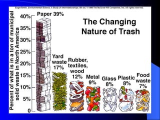 This document discusses solid waste management and disposal methods. It outlines that as consumerism increased following WWII, so did municipal solid waste production. Traditional waste disposal methods like dumping and burning are no longer acceptable. Current primary disposal methods are landfilling and incineration, but both raise environmental concerns. Source reduction through less consumption and packaging is presented as the most effective approach. Recycling is growing but faces economic challenges if markets don't exist for recycled materials. Overall waste prevention through reduced consumption is identified as the most fundamental solution.