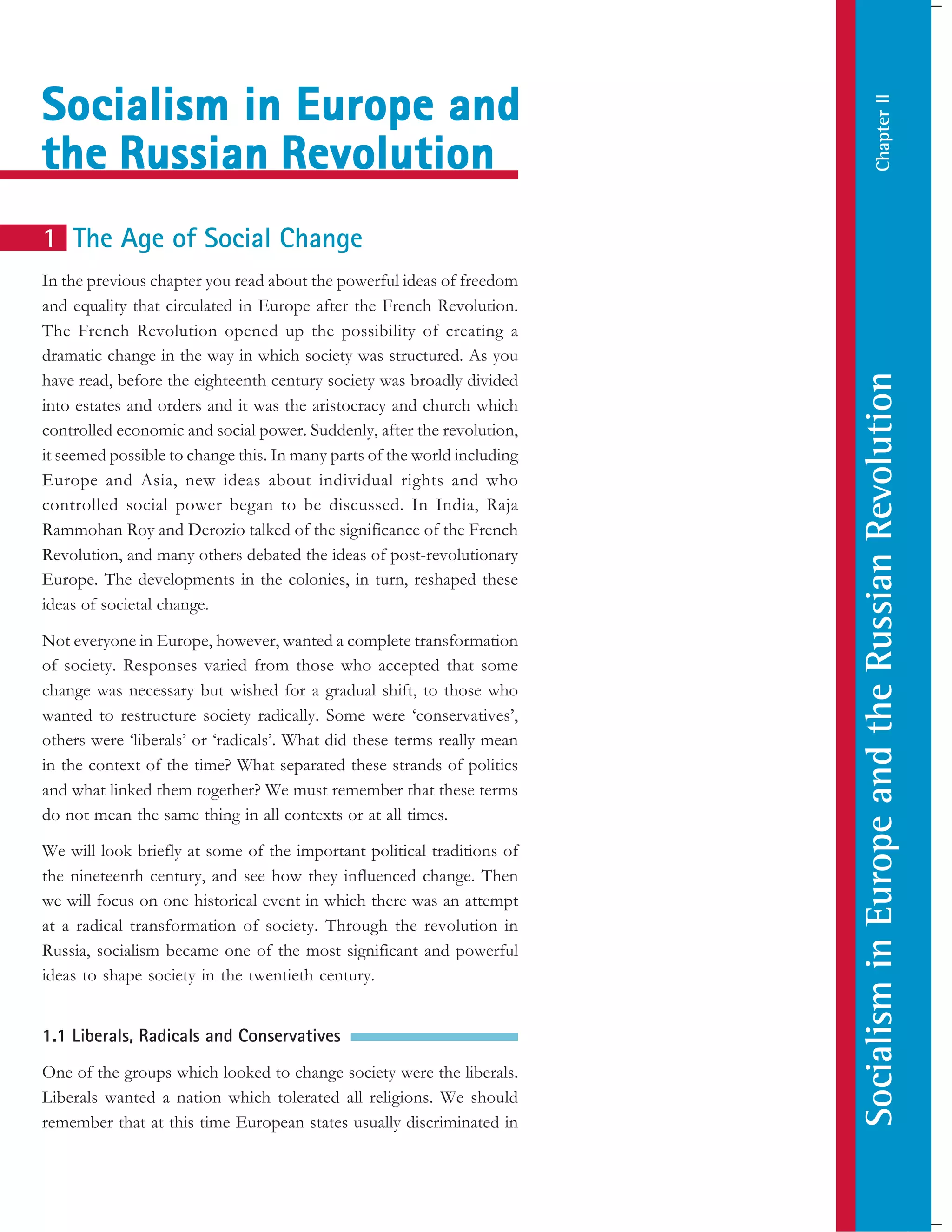 The document provides background on the rise of socialism in Europe in the late 19th century. It discusses the political ideologies of liberals, radicals, and conservatives that emerged after the French Revolution. Industrialization led to poor working conditions, which liberals and radicals sought to address. Socialists advocated for replacing private property with collective social control. The Russian Revolution of 1917 was a significant event that brought socialists to power in one of the least industrialized European states. It overthrew the Russian monarchy and established the Soviet Union.