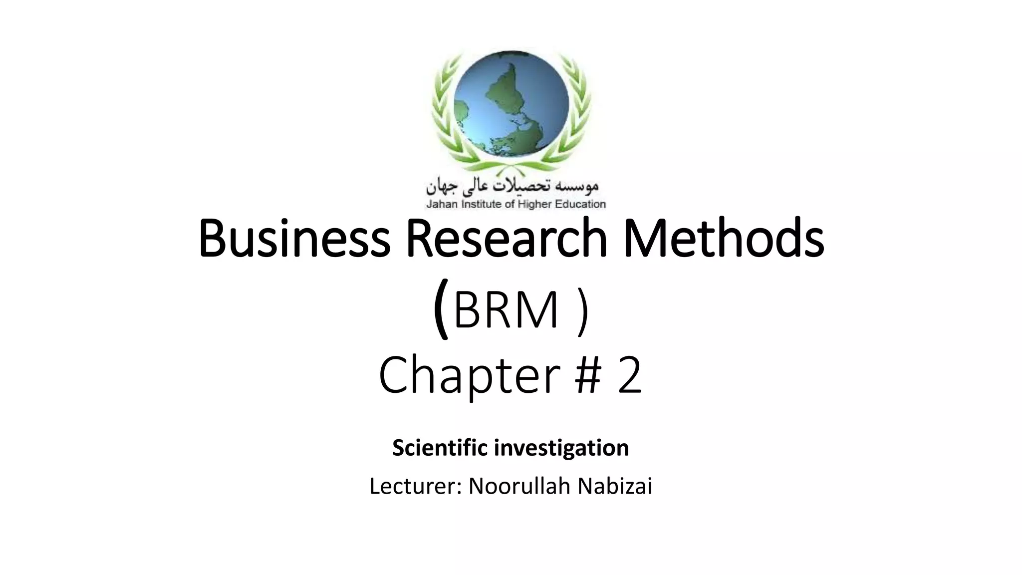 This chapter outlines the scientific investigation process and key hallmarks of scientific research. It discusses the hypothetical-deductive method which involves observation, preliminary information gathering, theory formulation, hypothesis generation, further data collection, data analysis, and deduction. The key steps are observation of a problem, gathering preliminary information to better understand it, formulating a theoretical framework to integrate relevant factors, generating testable hypotheses, collecting more data to test the hypotheses, analyzing the data, and deducing conclusions. Rigor, testability, replicability, precision, objectivity, generalizability, and parsimony are important hallmarks of scientific research.