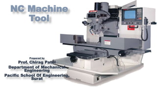 NC machines are numerically controlled machine tools that are programmed to automatically perform manufacturing operations. The key elements of an NC machine include the part drawing and program, program tape, machine control unit (MCU), and machine tool. The MCU reads and interprets the NC program from the tape or file to control the machine tool's functions like positioning the tool, controlling feed rate and spindle speed, and changing tools. NC machines offer advantages like increased accuracy and productivity compared to manual machine tools.