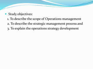This document discusses operations strategy and its development. It begins by defining strategy and describing the strategic management process. It then outlines the key steps in strategy formulation, including environmental scanning, internal analysis, and developing corporate, business, and functional strategies. The document also discusses developing an operations mission, objectives, priorities, and policies. It provides examples of operations objectives like cost, quality, delivery, and flexibility. Finally, it discusses elements of operations strategy like production system design, technology selection, and resource allocation.