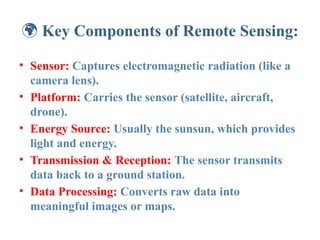 1. **Definition of Remote Sensing** – The process of collecting information about an object or area from a distance using satellites, drones, or aircraft.