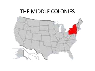 The Middle Colonies consisted of New York, New Jersey, Pennsylvania, and Delaware. New York was originally a Dutch colony called New Netherland but was taken over by the English in 1664. New Jersey was split between Lord Berkeley and Sir George Carteret, who offered settlers cheap land and religious freedom. Pennsylvania was founded by William Penn as a place of religious tolerance and prosperity.